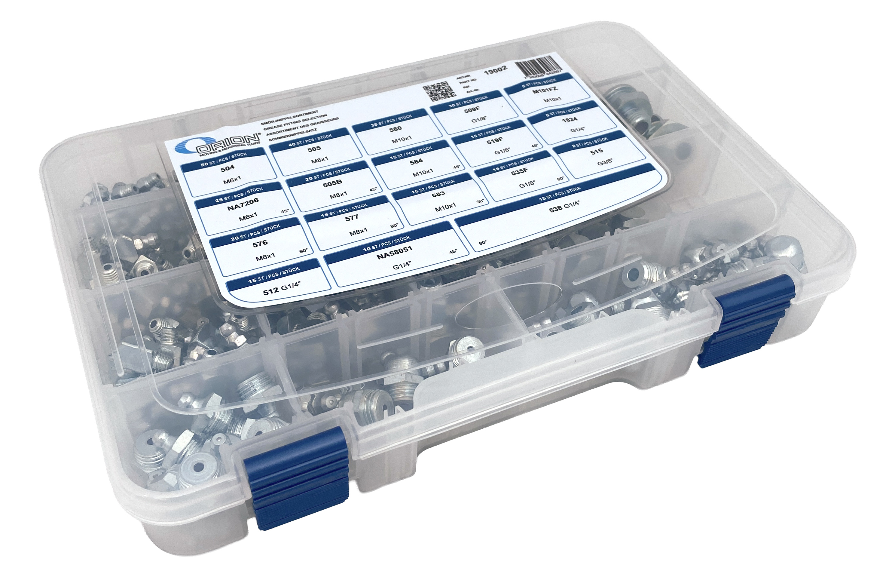 Assortment box with the 17 most commonly used hydraulic fittings. Contains an assortment of G1/4”, G1/8”, G3/8”, M10x1, M8x1 and M6x1, in 45° and 90° design, in all a total of 347 fittings. The box is made of crush proof plastic.
