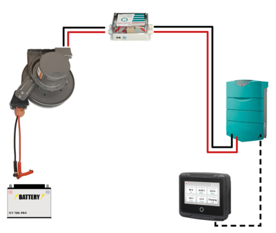 Complete for charging 12V vehicle batteries. Includes wall mounted charging unit, control panel, hose reel and required components for installation.