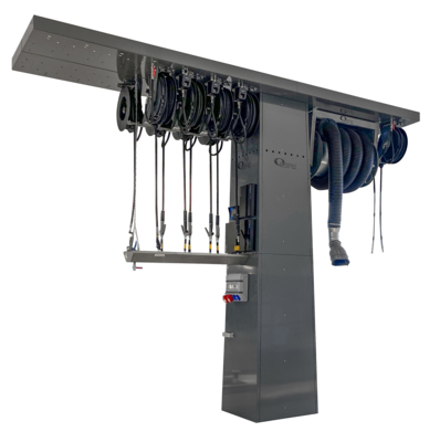 The Workshop tower can be equipped with a variety of product and provides a single source center for oil, grease, antifreeze, air and exhaust systems. For up to 16 Hose Reels. Supplied without equipment.