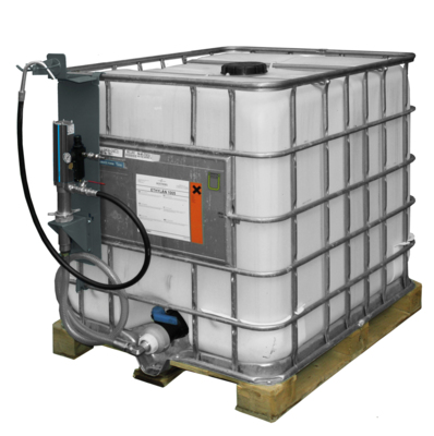 1:1 ratio air operated oil pump mounted on a bracket on the side on the container. The pump outlet is fitted with a shut off valve with hooked outlet nozzle for dispensing directly into measures or containers.