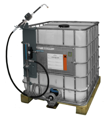 Distribution Kit. 3:1 ratio air operated oil pump mounted on a bracket on the side on the container. The pump outlet is fitted with a 3 metre 1/2" distribution hose and digital hose end meter (20371).