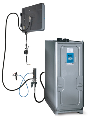 Fresh oil tank 1,500 l with 3:1 pump, hose reel and meter