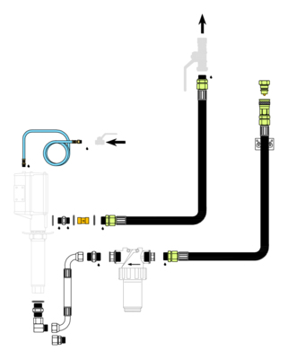 Incl. strainer 29300, suction hose 1" with quick coupling, pump wall bracket 28524 and non return valve 28295 to mount at the pump outlet.